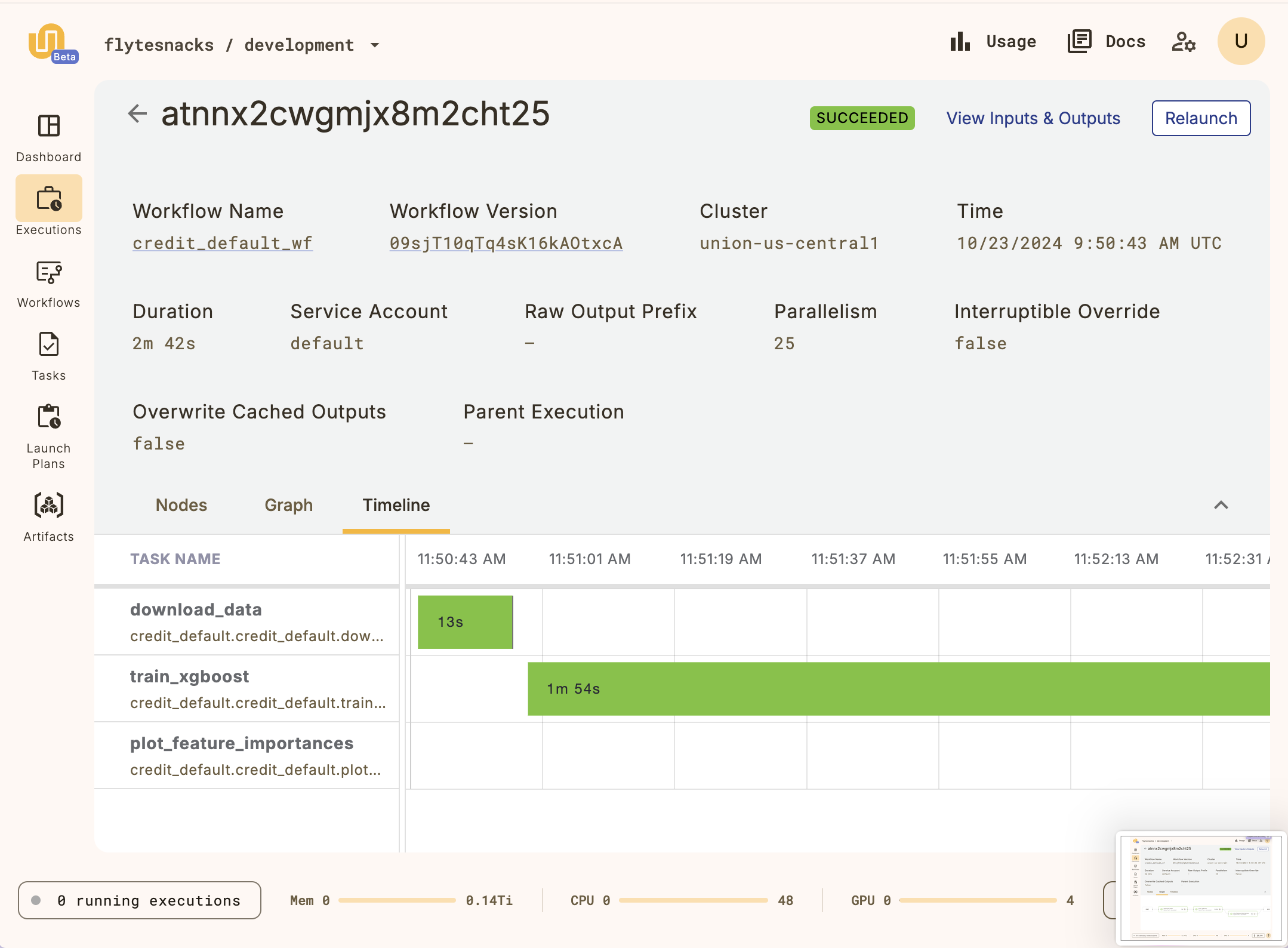 The default tab within the execution view is the Nodes tab. It shows a list of the Union.ai nodes that make up this execution (A node in Union.ai is either a task or a (sub-)workflow).